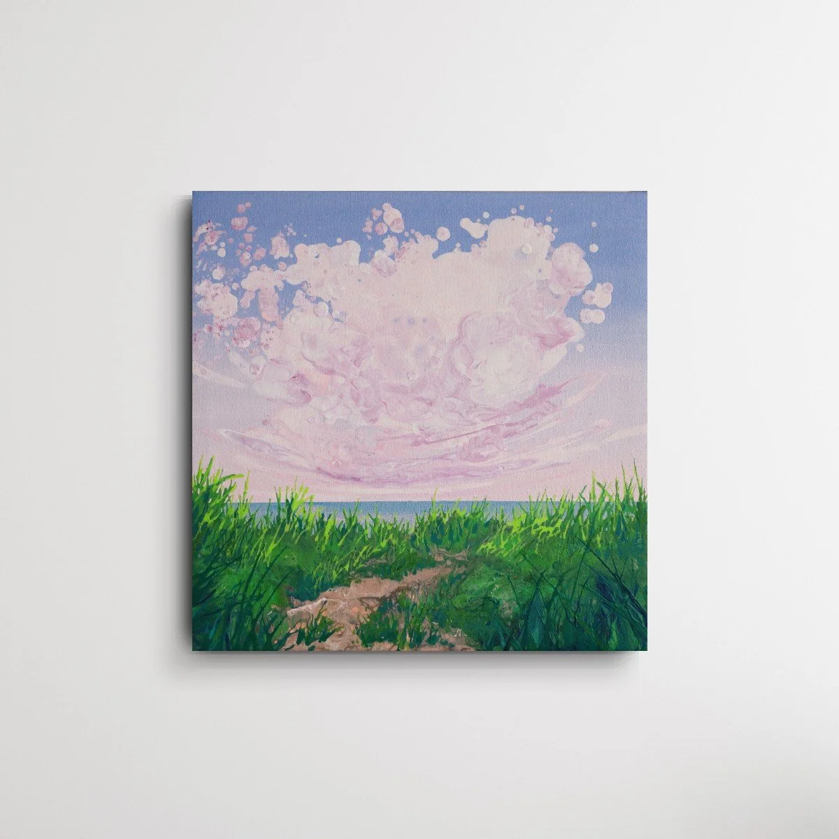 ’By the Shore’ presents a serene landscape dominated by lush grass in the foreground and a calm horizon in the back. A pathway cuts towards distant water, which evolves into an expansive sky full of billowing soft purple and white clouds.