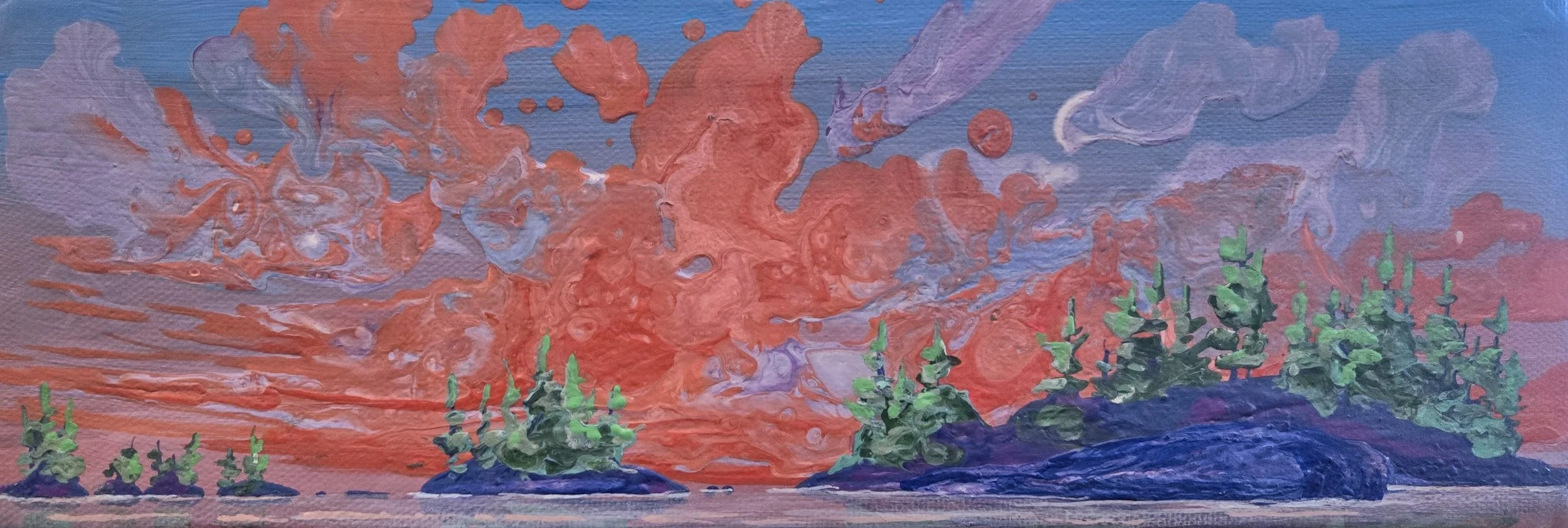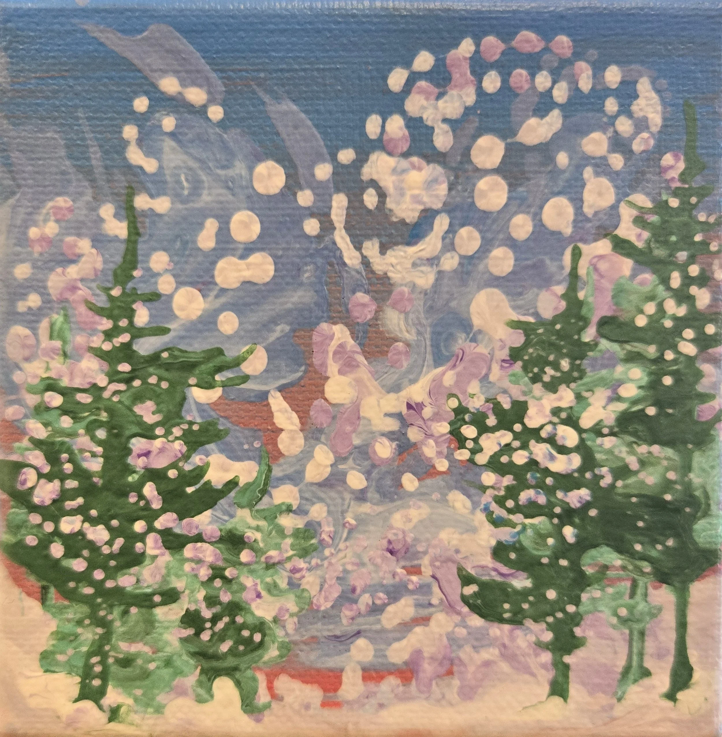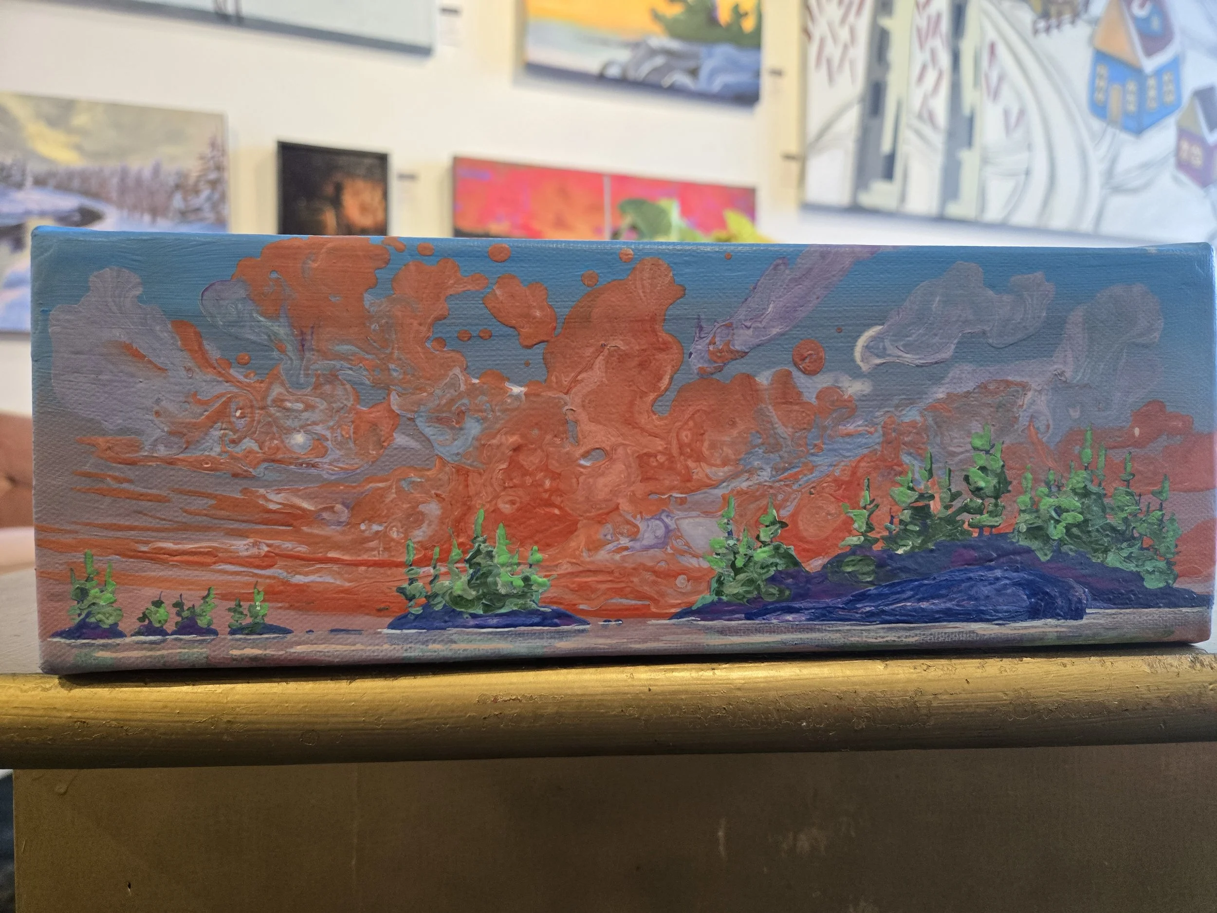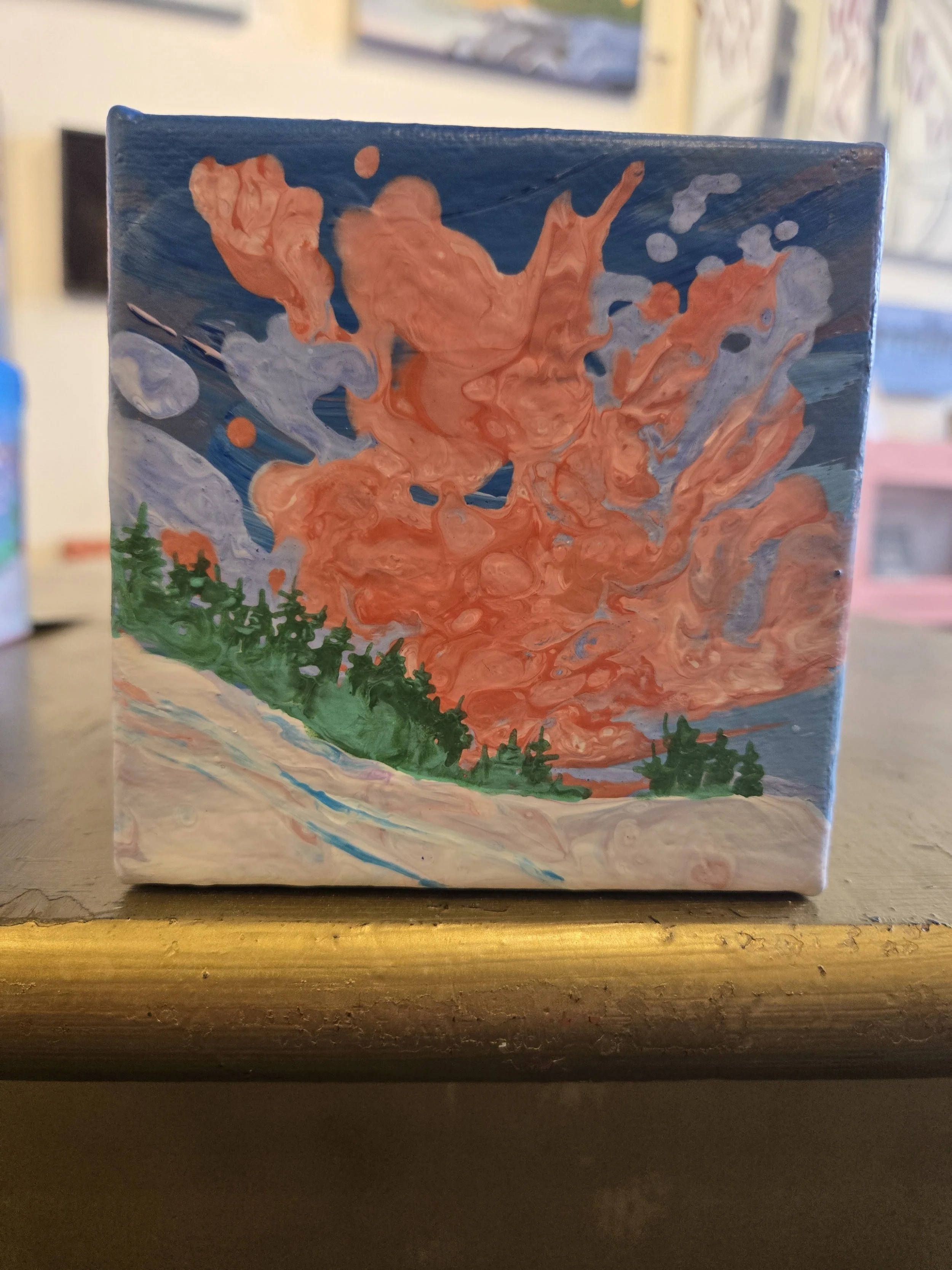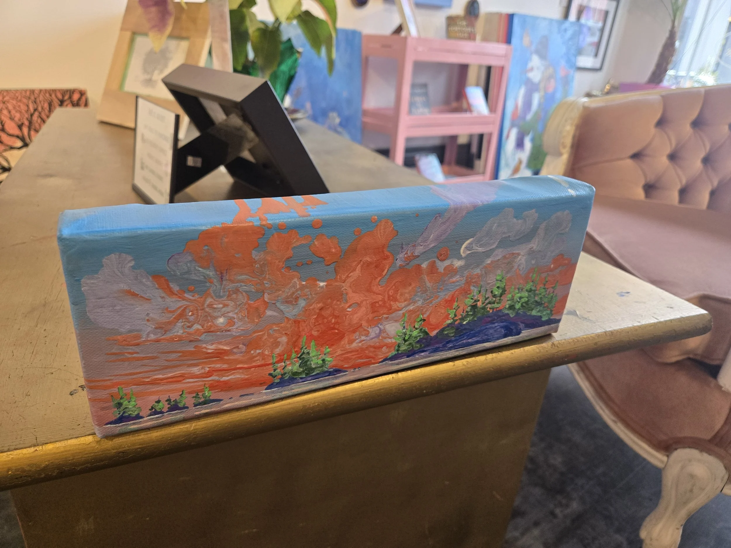 My painting “Immersion” is an acrylic poured painting full of pops of colour and bubbles. The white/ pink and dark purple clouds plummet toward the horizon line, drawing the eye towards the bottom right canvas. Groups of abstract pine trees frame and balance the painting.