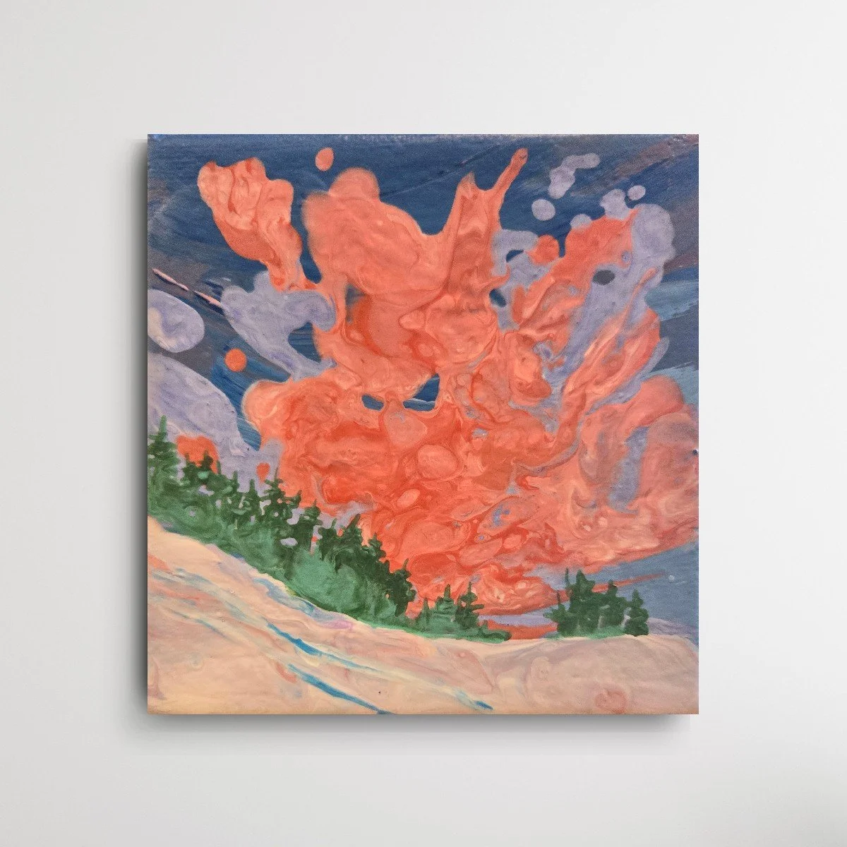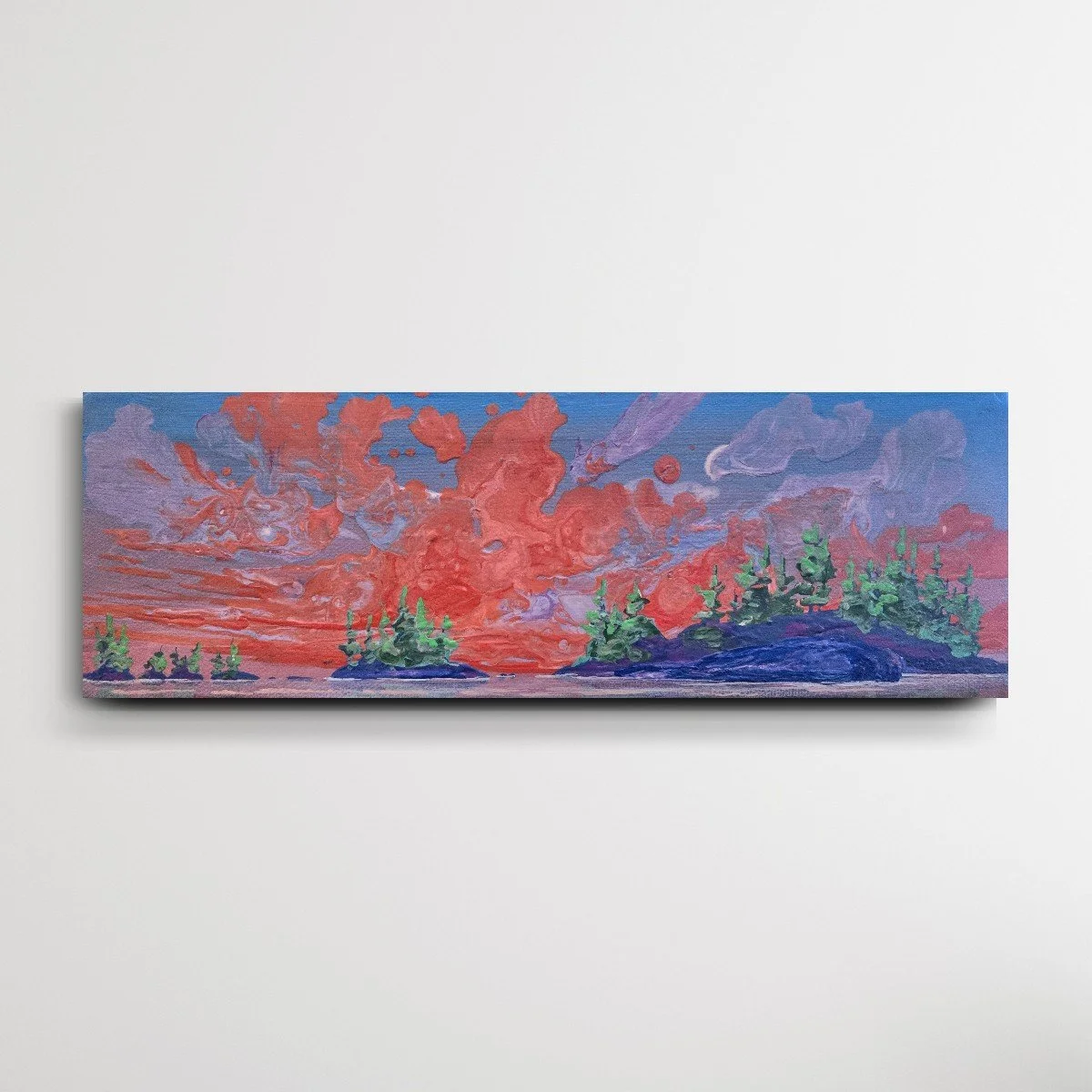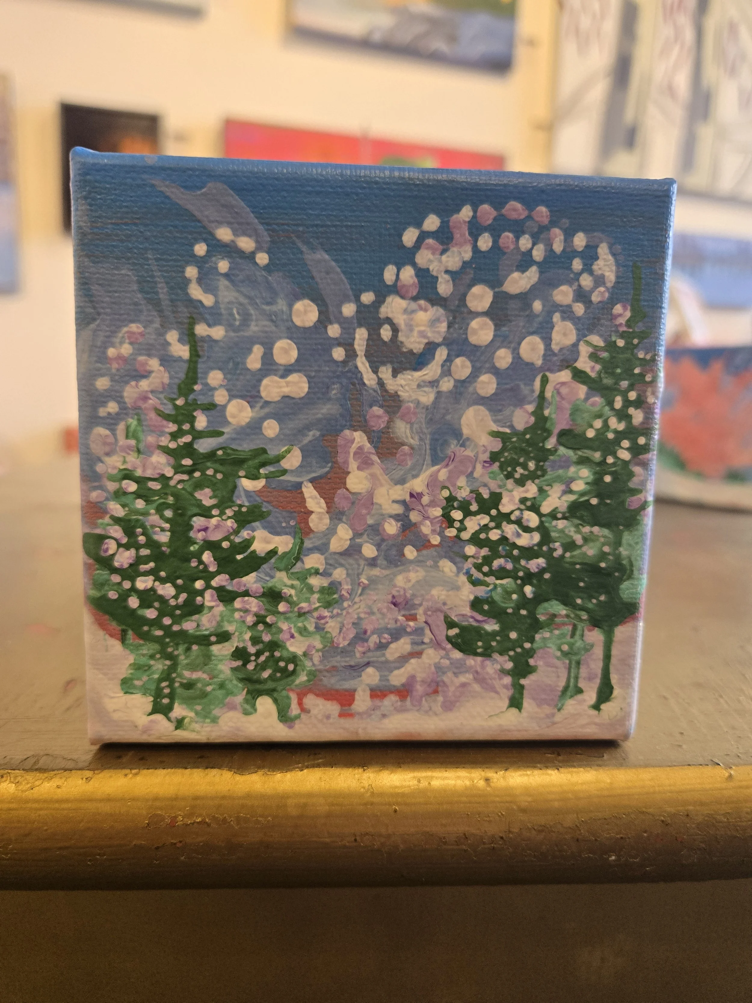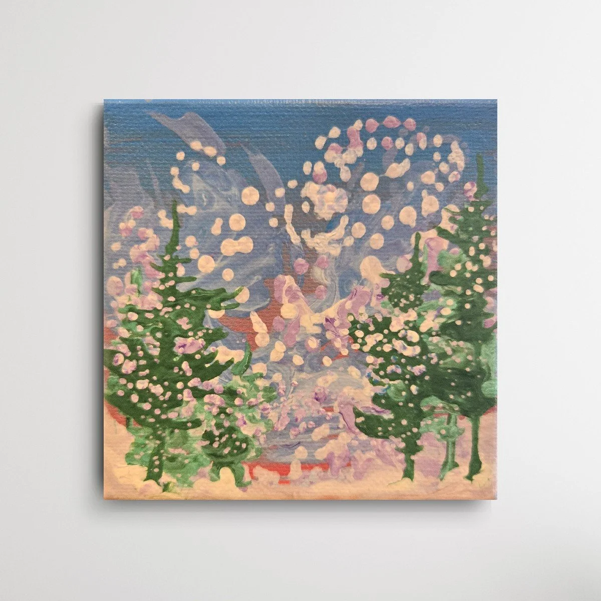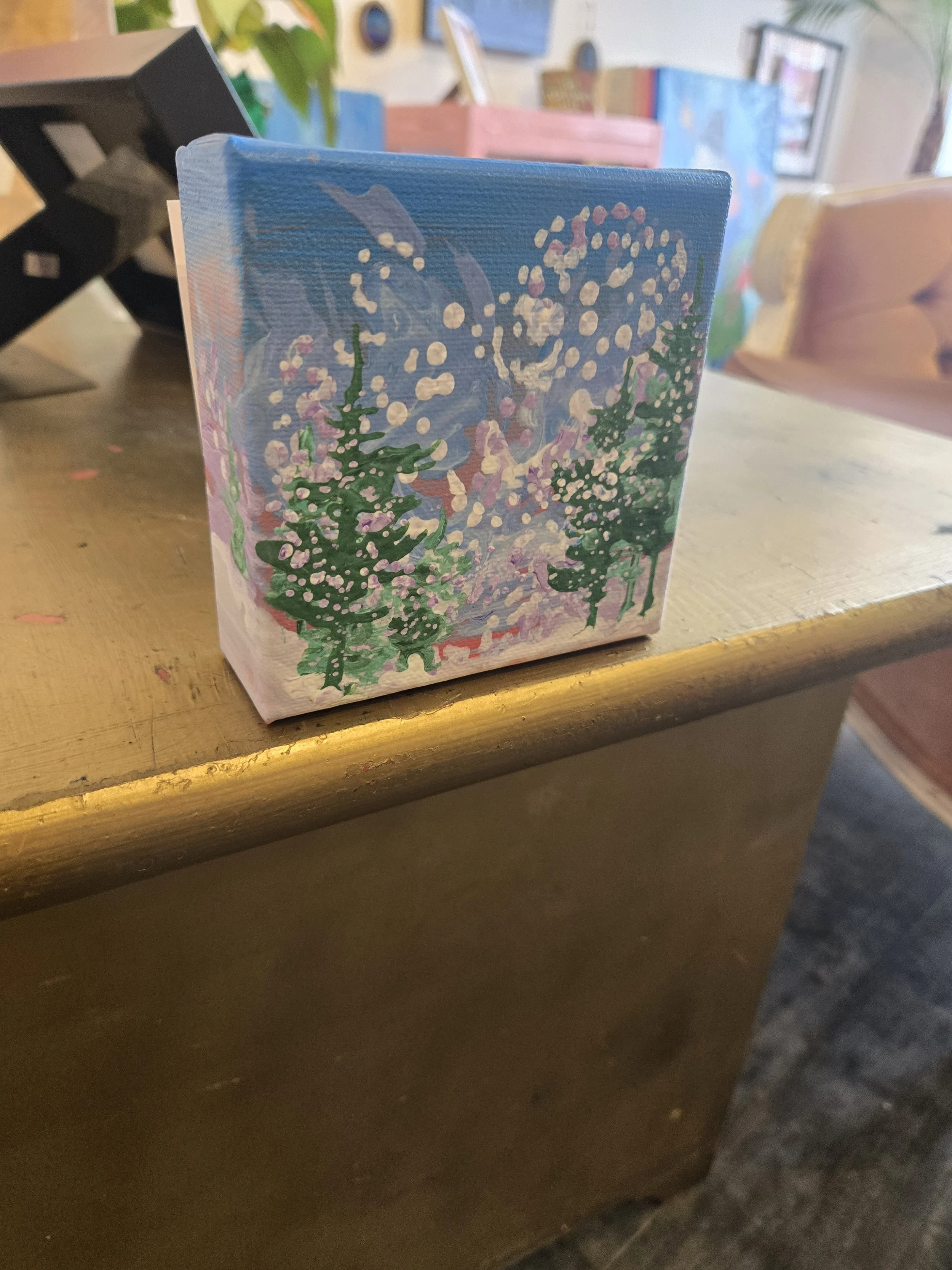 My painting “Immersion” is an acrylic poured painting full of pops of colour and bubbles. The white/ pink and dark purple clouds plummet toward the horizon line, drawing the eye towards the bottom right canvas. Groups of abstract pine trees frame and balance the painting.