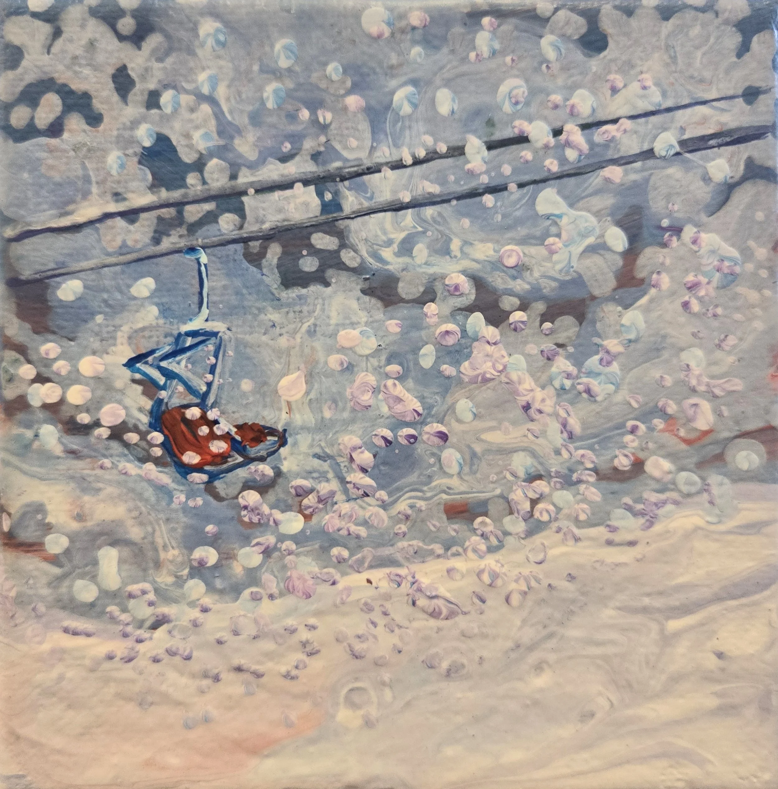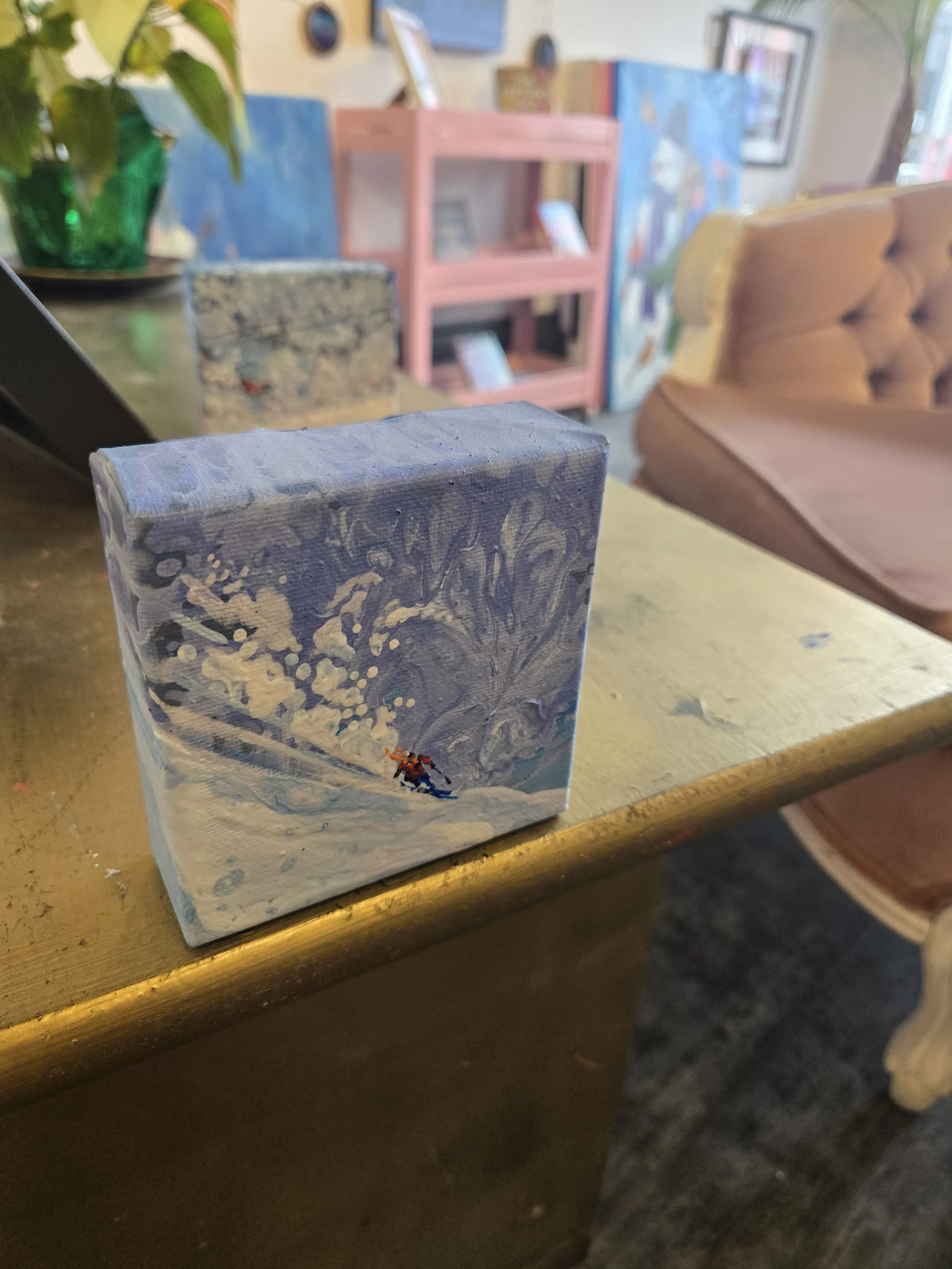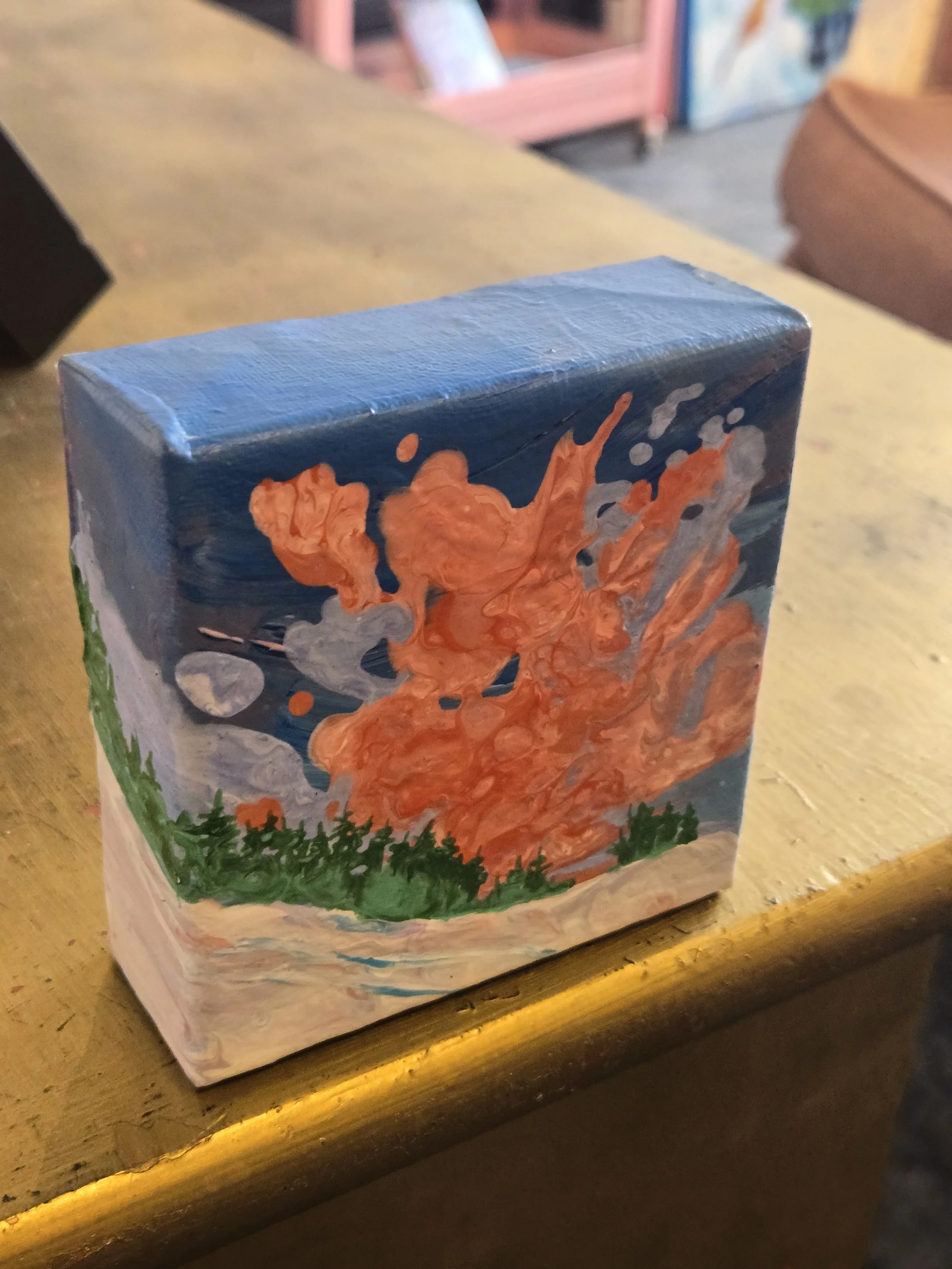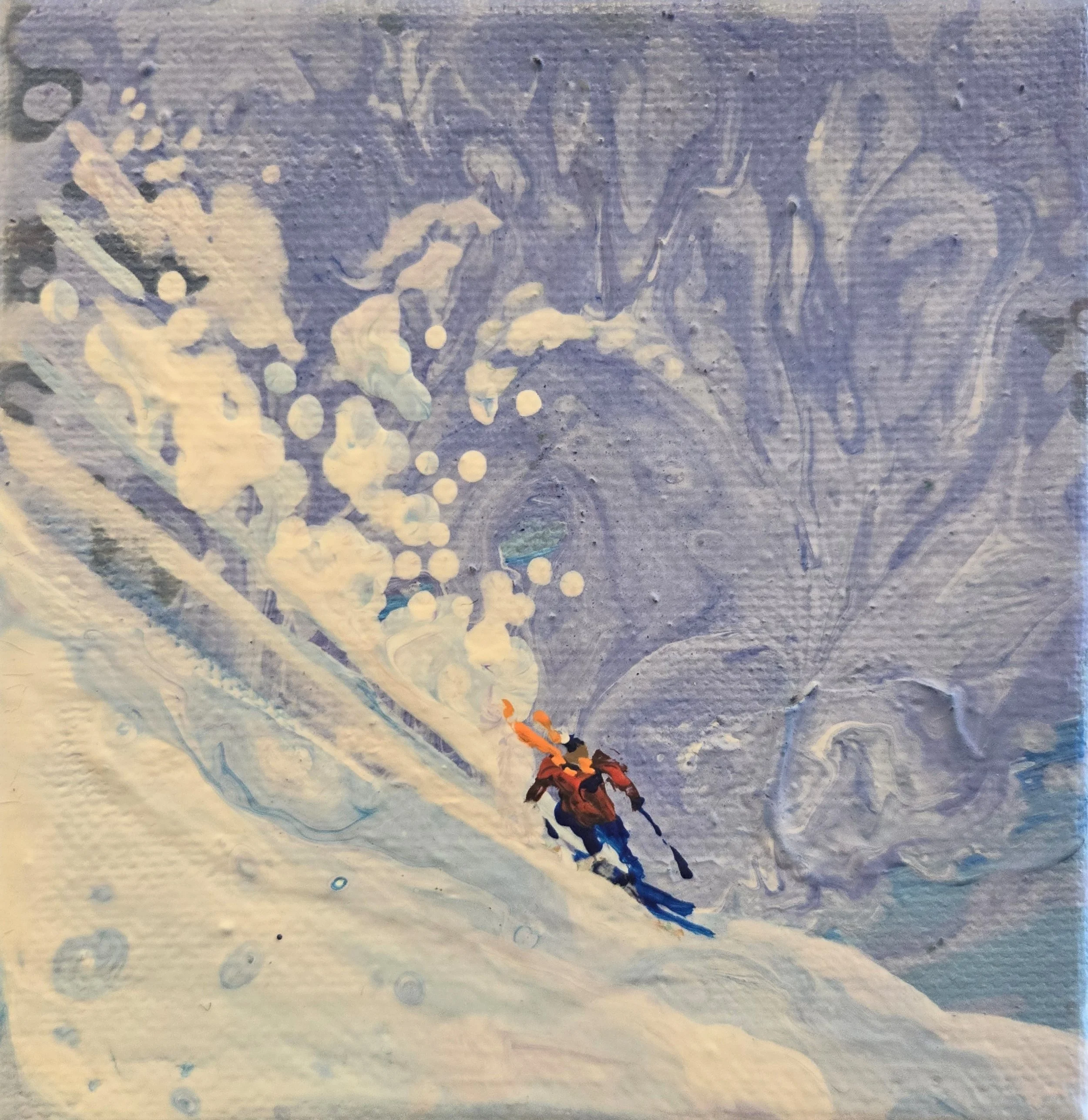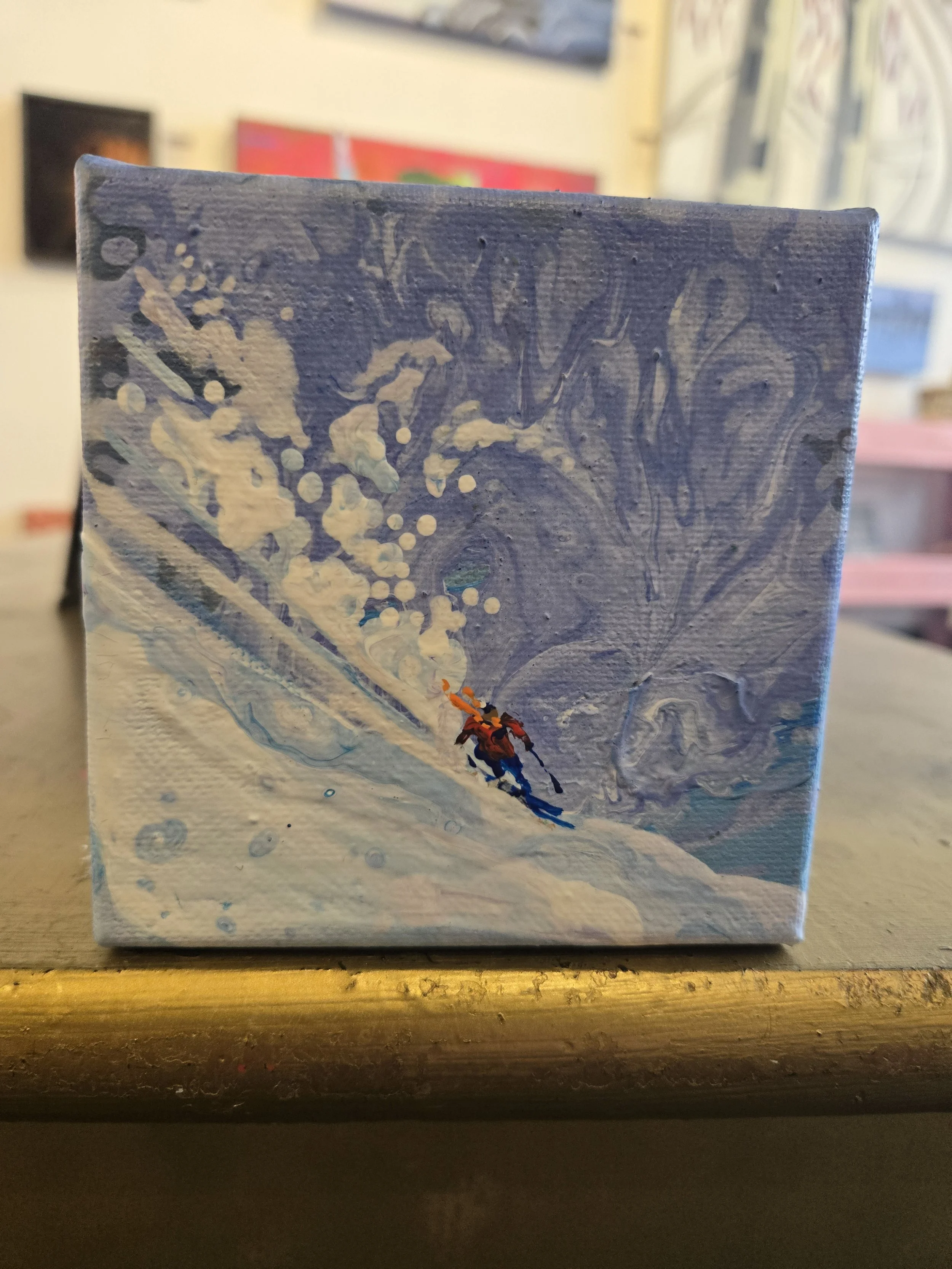 My painting “Immersion” is an acrylic poured painting full of pops of colour and bubbles. The white/ pink and dark purple clouds plummet toward the horizon line, drawing the eye towards the bottom right canvas. Groups of abstract pine trees frame and balance the painting.