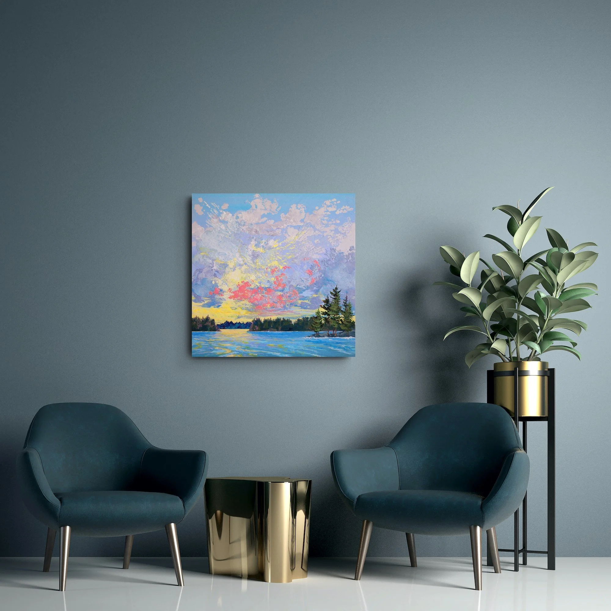 Canvas: Gallery stretched Cotton Canvas, varnished twice, signed on the back.