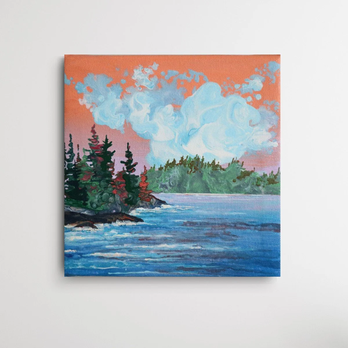 ’Sundance’ is an acrylic poured painting featuring a soft sky over trees sitting on choppy water.